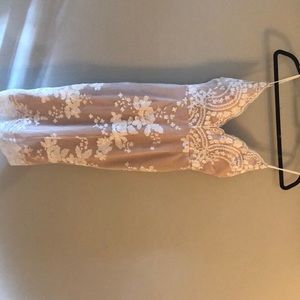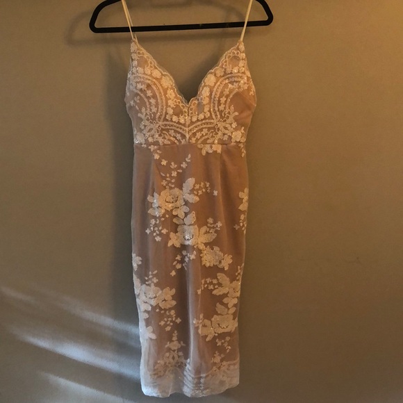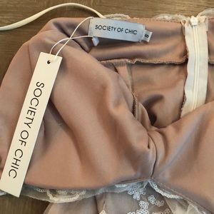 Gorgeous never worn society of chic dress. Runs small. Has mesh outer layer with white sequins and nude underlay. Has NO stretch. Never worn.