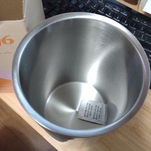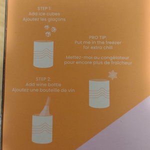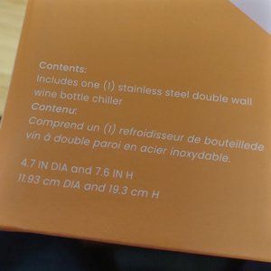 Brand new, never used. Only taken from the box once to snap photos. Stainless steel, double wall wine bottle chiller. 4.7" diameter, 7.6" tall. Dishwasher safe.