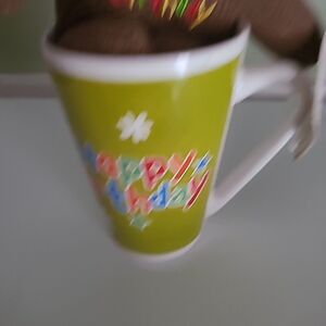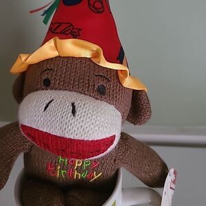 Pre-owned in new unused condition. Festive Sock Monkey with Happy Birthday on sweater and a Happy Birthday mug.