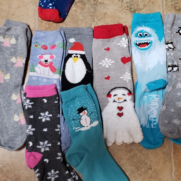Snowflakes, Angels, Polar Bears, Penguins, Snowman toe socks and Monster on Rudolph.