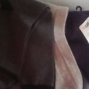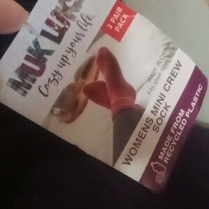 muk luks crew socks and 2 higher length total of 4. 2 crew are plum color n taller 2 are light grey and a darker grey with black size 6-11