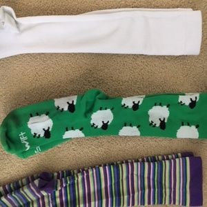 Compression socks; set of three; pretty good condition' One white pair, one stripe pair, one green pair with white lambs.