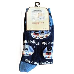 The Socksmith Women's Crew Socks Enjoy The Ride Vintage Trailer Novelty Footwear is a fun and unique pair of socks featuring a vintage trailer camper pattern. Made from a comfortable cotton blend material in navy color, these mid-calf socks are machine washable and suitable for casual occasions. The retro theme and novelty design make them a perfect choice for those who enjoy outdoor activities like camping and glamping. One size fits most, making them a versatile addition to any wardrobe for all seasons. Made in South Korea, these crew socks by Socksmith are a stylish and playful choice for women.