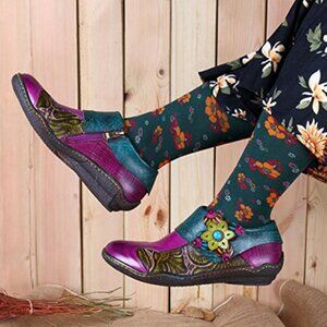 Socofy Boone Leather Purple Turquoise Colorful Floral Shoes Size 5.5 / 36 Artsy