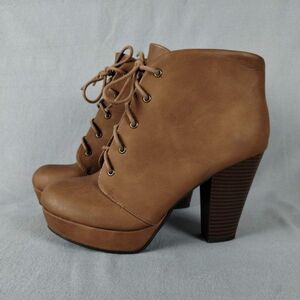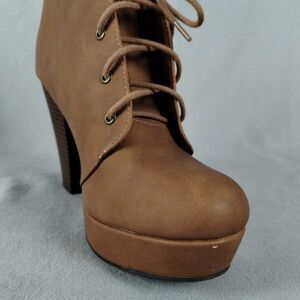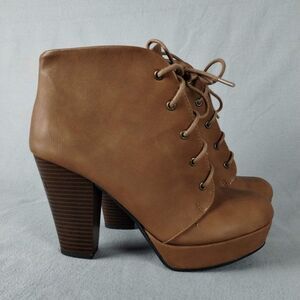 Soda Almond Toe Lace Up Platform Stacked Heel Ankle Booties Brown, Size 8