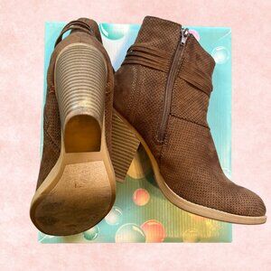 Lightly used Soda brand ankle boots in a rich brown suede finish. Worn only once or twice, still in very good condition. Features a sturdy block heel, side zipper for easy wear, and perforated design for added style. Comfortable yet chic—perfect for casual outfits or dressing up!