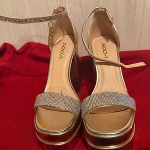 Soda Gold Rhinestone Platform Block Heels