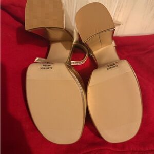 Shiny gold platform block heels with sparkling rhinestone straps. Adjustable ankle buckle for a secure fit. Bold platform adds dramatic height and style.