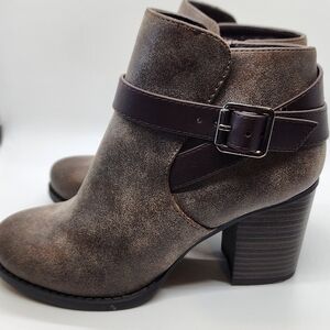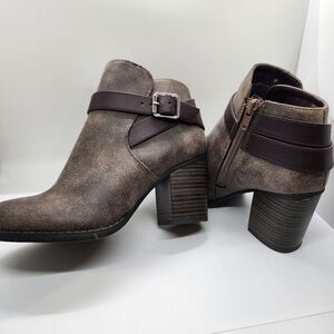 New with box. Side zip ankle boots with buckle detail. Grayish brown in color. Size 6.