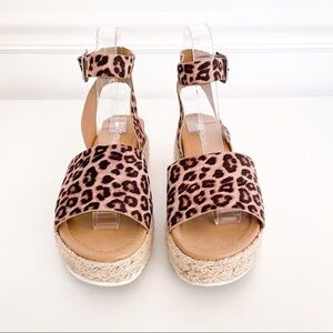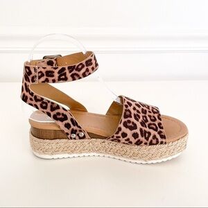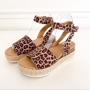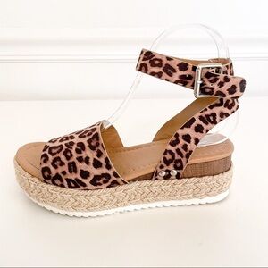 Soda Platform Espadrille Leopard Sandals. Women's Size 7. Leopard print, platform flat sandal, adjustable ankle strap. Very good pre-owned condition, minor signs of wear throughout. Size not listed, measured approximately to a women's size 7.