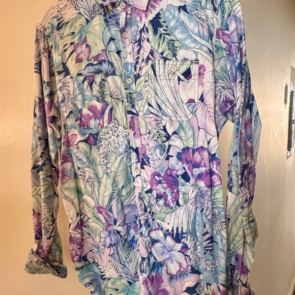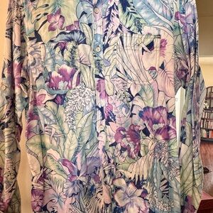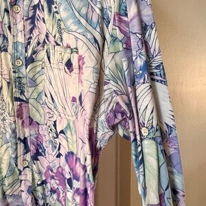 Soda Purple and Green Casual Button Down Shirt with Artistic Floral Design