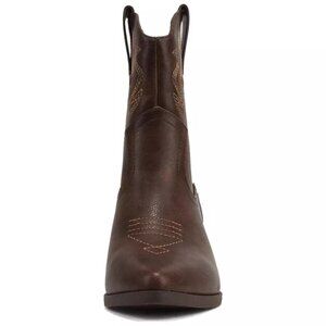western ankle boots, Soda Blazing boots, faux leather boots, brown booties, western booties, ankle bootie shoes, urban cowgirl boots, casual western boots, brown pointed toe boots, women's low heel boots, stylish stitched boots, cowboy-inspired boots, comfortable heeled boots