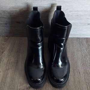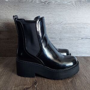 A classic Chelsea boot with a chunky lugged platform for a bold fashion statement, it features faux patent leather material, pull on style, and a platform approx measures 1 1/2" & 2 1/2" block heel.