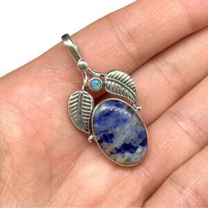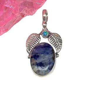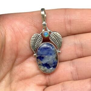 Genuine sodalite & blue fire opal pendant with leaf design. Solid sterling silver and stamped 925. Total length is just under 1 5/8” long.