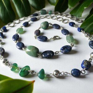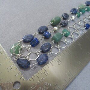 The double wrap design measures approximately 43 inches, including the clasp. The alternating sections of bead work include sodalite, nephrite jade, iolite, and hematite plated with sterling silver. The hex links and clasp are sterling silver plated over brass. This necklace carries the weight of approximately 4 oz in stone, so if you have sensory issues, please take that into account.