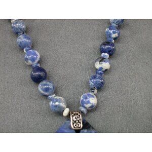 This elegant necklace features a stunning sodalite teardrop pendant and a beaded chain. The antique silver clasp adds a touch of vintage charm, making it an excellent accessory for a sophisticated look. The blend of deep blue and white hues offers a unique and eye-catching design, suitable for formal occasions or daily wear.