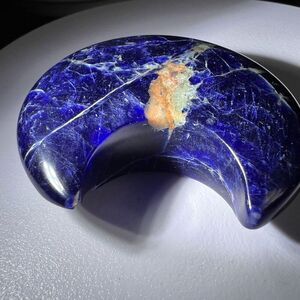 A sodalite crystal moon carving, with its deep blue hues and white / tan marbling, symbolizes inner peace and clarity. Known for enhancing intuition, it aids in emotional balance and rational thought. This stone fosters calm communication, self-acceptance, and spiritual growth, making it a powerful tool for meditation.