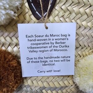 Add a pop of playful charm to your wardrobe with this Soeur Du Maroc handwoven straw tote bag. Featuring cream, white, and rust-colored pom poms, this boho-chic basket purse blends artisanal craftsmanship with effortless style.. Soeur du Maroc Pom Pom Embellished Straw Tote Bag XL Purse Beach Summer