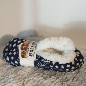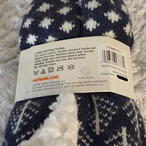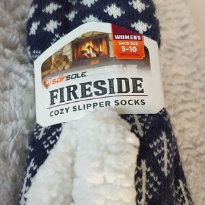 These New with tags blue and white faux fur very plush Fireside Cozy woman's slipper socks fits a shoe size 5-10. 54% polyester 46% acrylic. All offers welcome.