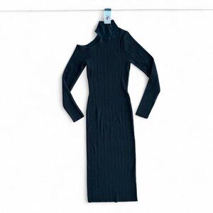 Ribbed black knit midi dress from Sofía Jeans (by Sofía Vergara) features a sleek high neckline with an asymmetrical shoulder cut-out for that subtle statement detail. Slim, body-skimming fit with long sleeves and stretch for comfort. Midi length makes it versatile for night outs, dinner dates, or styled casually with sneakers and a leather jacket.