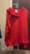 Bold red windbreaker by Soffe. Features a hood and front pocket. Ideal for outdoor activities.