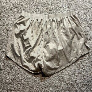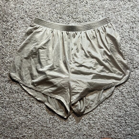 Classic Soffe running shorts, often called “Silkies” by Marines, in a tan color with an elastic waistband and lightweight, silky feel. Tagged size Large and nicely broken in but still in good pre‑owned condition with plenty of life left for workouts, rucks, or casual lounge wear.