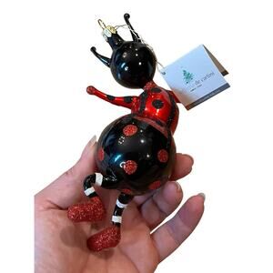 The Soffieria de Carlini Lady Bug ornament is a charming and unique addition to any holiday decor collection. This 6-inch dancing anthropomorphic ladybug ornament is made of mouth-blown glass with hand-painted details, showcasing a contemporary style with a red color theme. Handcrafted in Italy by the renowned brand Soffieria De Carlini, this ornament is a whimsical and delightful piece that will make a statement during the Christmas season. Perfect for collectors and those who appreciate intricate and artistic decorations, this Lady Bug ornament is sure to bring joy to any festive display. It is new with tags, in excellent condition.