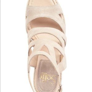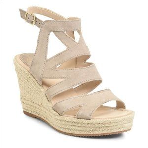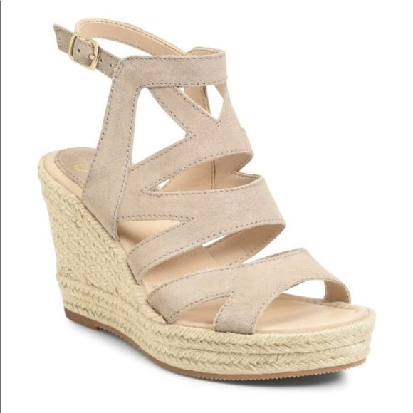 A strappy sandal is crafted from suede and set on a jute-wrapped wedge to dial into the season's boho mood. Sizing: True to size. Open toe - Cutout Adjustable ankle strap with buckle closure - Espadrille wedge heel - Approx. 2.75" heel - Imported. Materials: Leather upper, synthetic lining and sole. Brand New, Never Been Worn and arrives in their original box.