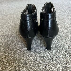 These leather woven booties have a peep toe and a front zipper. They are in great condition. The heel is approximately 4 inches.