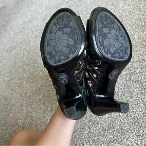 Sofft Black Leather Strappy Woven High Heel Booties with Front Zipper, Size 7.5