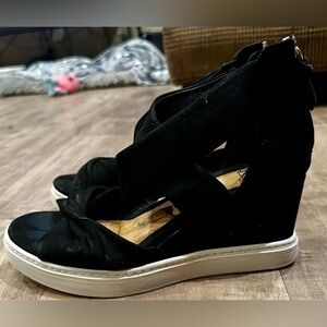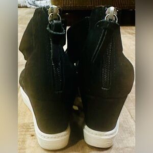 Worn 3-5 times, in perfect condition. Comfortable wedge heel, versatile black leather. True to size.
