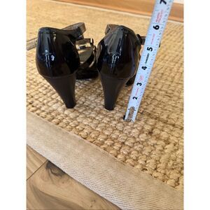 Stylish black patent leather strappy platform sandals by Sofft featuring a tall tapered heel, 1” platform, and gold-tone stud accents. Adjustable buckle closure and cushioned footbed for added comfort. The glossy leather finish and multi-strap design make them perfect for dressy looks or evening wear. Pre-owned in very good condition with light wear on soles and minimal signs of use overall. Please see all photos for details.