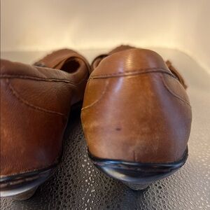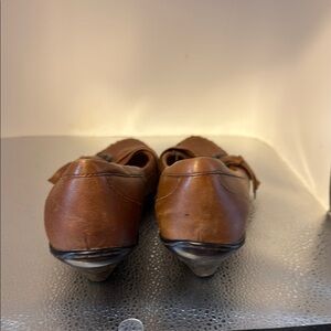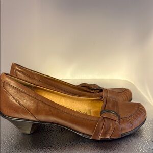Elevate your style with these Sofft brown leather heels, featuring a timeless design and a comfortable fit. Crafted from supple leather, these heels offer a sophisticated look suitable for both casual and business casual occasions. The rich brown color adds a touch of elegance to any outfit.