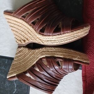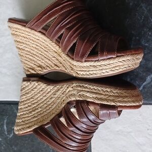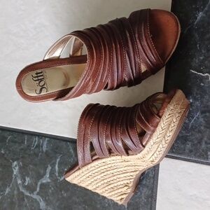 Sofft Brown Leather Wedge Platform Espadrille Sandal Heels Women's Size 6