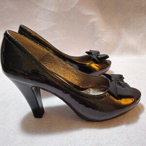 Sofft Burgundy/Wine Patent Leather Womens Pumps W/ Bow Size 8M 4" Heel. Peep toe