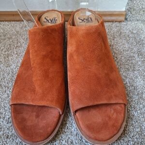 Sofft Carrey Womens Pumpkin Suede Slide sandals. Open Toe. Heeled. Like new. Size 9.5 Heel height 2" measurements are approximate