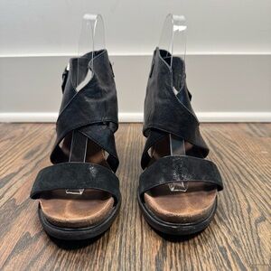 Preloved Gently worn Size 6.5 Genuine leather upper Buckle closure 3.5” heel and 1” platform Molded cork insole