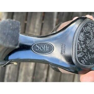 These are Sofft Gazelle peep toe pumps in brown suede, featuring a 3" cone heel and an ankle strap with a buckle closure. The shoes are size 6M with a mid heel height. They have a stylish T-strap design and a rubber outsole, making them a chic choice for women's footwear.