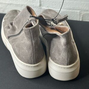 Stylish gray suede ankle boots featuring a convenient side zipper. Perfect for casual wear.