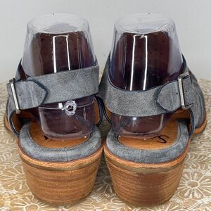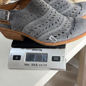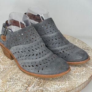 Stylish gray mules with perforated design. Comfortable wooden heel. Adjustable strap for perfect fit.