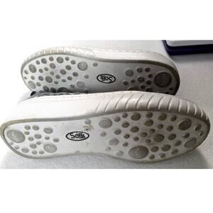 These Sofft slip-on sneakers feature a gray leopard print canvas upper with a comfortable and durable white sole. The shoes are designed for casual wear and offer great support for daily activities. The inner sole shows light wear, and the outer soles have some signs of use, but the shoes remain in good condition with no notable flaws.