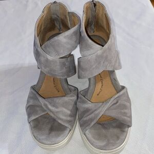 Sofft Gray Wedge Leather Suede Sandals Wo size 7 Back ankle zipper criss cross straps Very good clean condition