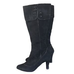 Stunning boots in black suede with cuffs and buttons. Zip closure. In good condition. A couple of small imperfections noted in the last photos. Size 6M.