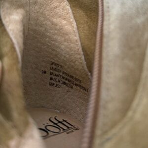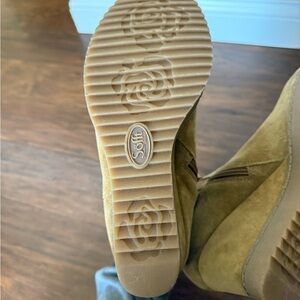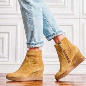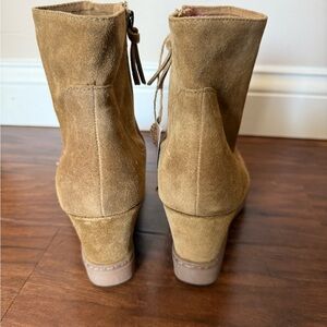 Chic camel ankle wedge booties by Sofft. Perfect blend of style and comfort. These boots are brand new without the original shoebox. These boots are made of an Italian waterproof suede and what I would call the camel color. These are a women’s size 9 as shown in the pictures. They have an inside ankle zipper with soft microfiber lining. A leather lined footbed, cushioned at ball, heel and arch. The heel height is 2 3/4 inches. All of my items are well cared for and come from a smoke-free home. Considerate offers are welcomed.