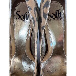 Sofft Size 8 Tan High Heeled Pump Suede Leather Printed Leopard Peep Toe Rosette