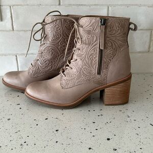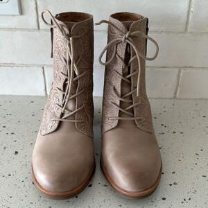 Sofft Sondra Light Taupe Leather Embossed Floral Shaft Block Heel Ankle Boots Size 9.5M