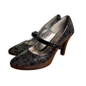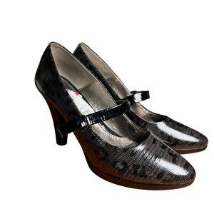The Sofft size 9.5 Leather Miranda Pointed Toe Mary Jane with a 3 1/2 heel in black taupe is a stylish and versatile heel perfect for various occasions. The lizard animal print pattern, buckle closure, and block heel add a touch of sophistication to this pump. Made with leather and featuring an adjustable strap, this shoe offers comfort and durability. Ideal for weddings, parties, workwear, or even casual or formal events, these heels are a fashionable choice for the modern woman.
