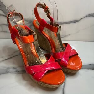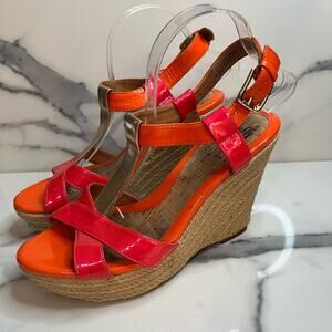 Sofft Wmns Orange Patent Leather Open Toe Strappy Jute Wedge Pedra Sandal Sz 10