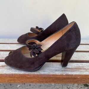 Step back in time with these charming Retro Style Sofft Geva Heels! Crafted in rich brown suede with delightful flower detailing, these Mary Jane pumps exude vintage flair and timeless elegance. Featuring a peep toe design and a comfortable 3" heel, these shoes strike the perfect balance between style and comfort. The sweet flower accent adds a whimsical touch, while the Mary Jane silhouette ensures a classic and sophisticated look. Preowned in good condition.