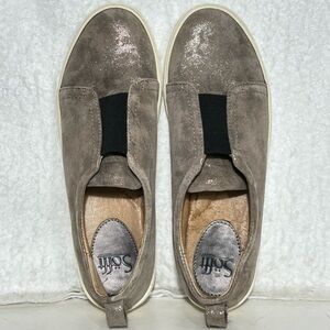 Sofft Womens Safia Metallic Leather Slip On Casual Sneakers Shoes. Color: Grey/Taupe. Pre-owned Condition - refer to pictures for description of shoes. No Rips or Tears. Smoke-Free. T